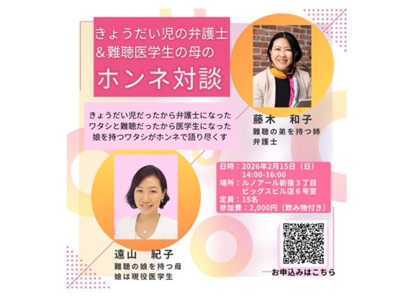難聴医学生を育てた親である遠山ママさんと難聴の弟さんがおられ姉としての悩みを抱えつつ育ってこられた藤木姉さんとの対談です。定員が15名と少なめなので、参加される方もホンネで質問したり感想を言ったりしやすいのでは? 日時は2月15日(日)14時より。東京の新宿。参加費2,000円。満席にならないうちにお早めにお申し込みください。申し込みは下記QRコードより。