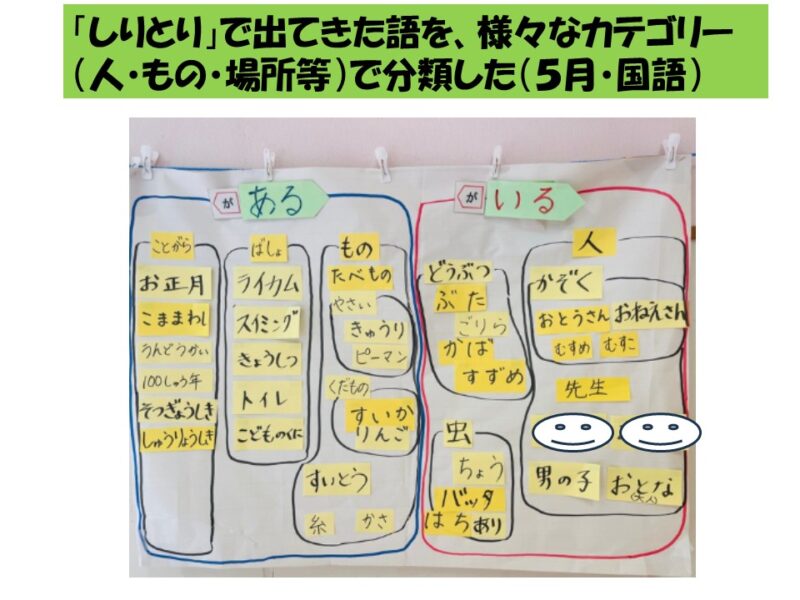 ここで紹介したのは小1年自立活動の年間指導計画です。助詞の指導、動詞の活用の指導、形容詞の活用の指導はもちろん、動詞語彙の拡充をねらって動詞リストも作成されているようです。これも重要な視点です。動詞が少ないと文が作れません。また、3学期には、「名詞句」も指導する計画のようです。日本語は語を説明する語句がその単語の前に置かれるという特徴があります(「聾学校」→「私が通っていた聾学校」→「6年間私が通っていた聾学校」)。この特徴を理解することが「複文」を身につけるうえで大切です。