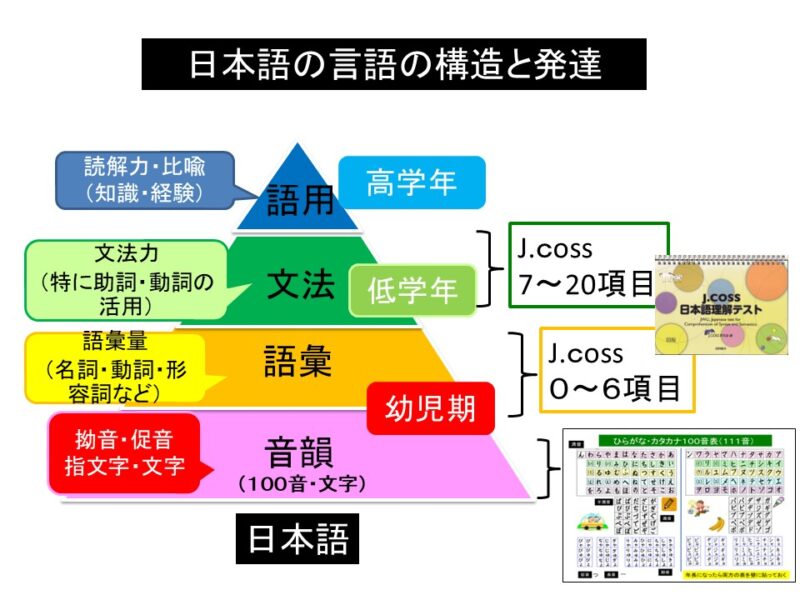 では、具体的に、どのくらいの語彙力・文法力があれば、小学校の教科書が理解でき、教科の学習に対応できるのでしょうか? その力を知るのに便利な検査が『J.coss(ジェイコス)』と言われる検査です。
