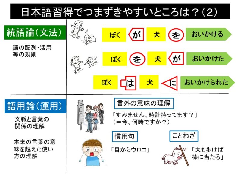 Jcossの文法項目の1項目め『名詞』から6項目めの『3要素結合文(非可逆文)』までは、その子どもの持っている語彙量の多少でほぼ決まります。そして7項目めの『置換可能文(可逆文)』以降は、助詞や動詞の活用が理解できていなければ正解できません。文章理解のためには、助詞と動詞の活用の理解は不可欠ですから、7項目めの『置換可能文(可逆文)』は、小1の教科書に入れるかどうかのいわば“分水嶺”と言ってもよいと思います。