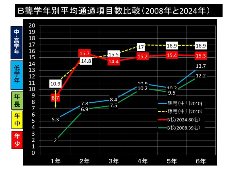 では、7項目に到達していない子どもには、小学校(部)入学部以降に、どのような指導が必要かと言えば、①助詞の指導(とくに「が、を、に、で、と」など)、②動詞と形容詞の活用を中心にした、日本語文法の指導です。このような指導によって本当に日本語の力はつくのでしょうか? おそらく読者の方の中には懐疑的な方もいらっしゃることと思います。そこで、10年以上にわたって文法指導を実践してきた「B聾学校」が、2008年に文法指導に取り組み始めたときの学年別のJcoss通過項目数と、2024年のJcoss通過項目数を比較したグラフを作成してみました。このグラフから、2008年頃の子どもたちは、ほんとうに日本語力の厳しい子どもたちが多かったこと、そしてそれから16年後の2024年ではJcossの成績つまり文法力が全体的に大きく向上していることがわかります。