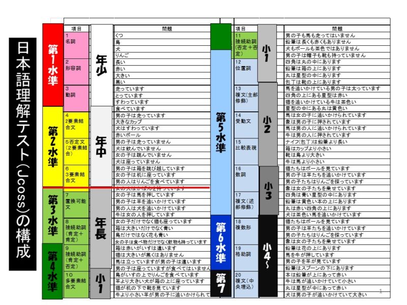 Jcoss(ジェイコス・日本語理解テスト)には20項目の文法項目がありますが、そのうち最初の方の7項目が「通過」できていれば、就学後の教科書を使った学習にだいたい対応できます(図の「第3水準」に到達している)。言い換えると“7項目以上通過”がきこえない子の就学時点での到達の目標と言ってよいと思います。