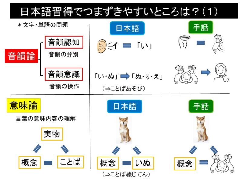 きこえない子は、これらのどの局面でもつまずく可能性があります。まず最初に「音韻」のところでは、きこえないために日本語の音韻が正確にききとれず、語が正しく習得できないことです。例えば、1歳ごろのきこえない子には、「いす」と「いぬ」の区別は容易ではありません。曖昧にしかききとれないからです(手話は「音韻」が視覚的な記号なので赤ちゃんでも区別が可能です)。