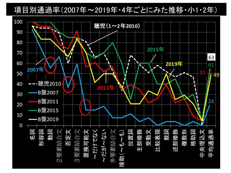 もう一つのグラフは、Jcoss20項目を横軸に並べ、縦軸にそれら20項目の文法項目の通過率(例えば、ある項目について10人中5人が「通過」していれば、その項目の通過率は50%)を示したグラフです。2007年から2019年まで4年おきにみた項目別通過率(小1,2年生のみ)の推移です。2007年当時の子どもたち(水色)は本当に厳しかったことがわかります。右端のJcoss全体(20項目)での平均通過率をみると24%ですから、通過項目数になおすと5項目ということになります。5項目通過は、聴児の年中レベルにあたります。