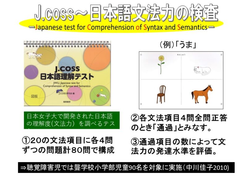 これまで、聾学校等で使われてきた日本語力を見る検査の中に『Jcoss(ジェイコス)』(日本語理解力テスト)というのがあります。この検査は、単語や文の問題文を、文字・指文字・音声等で提示して4つの絵から正答と思うものを一つ選ばせる検査ですが、この検査を使うことで、教科書にすぐそのまま入れるレベルの日本語力を身に着けているかどうかを知ることができます。
