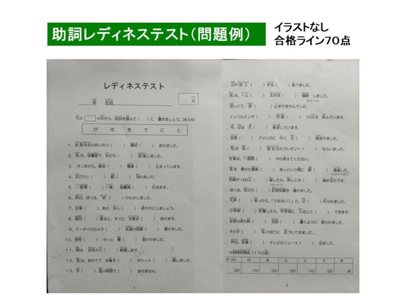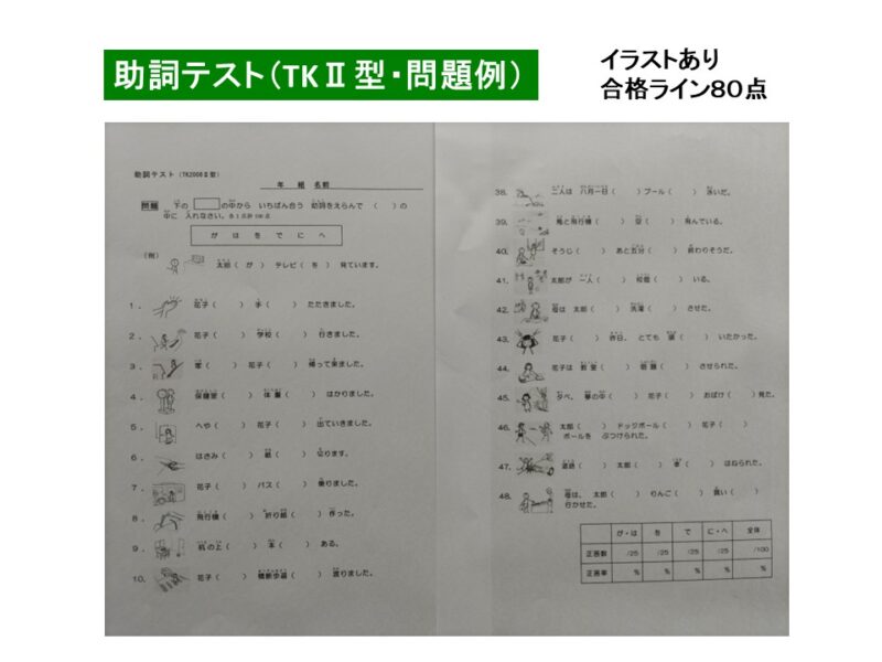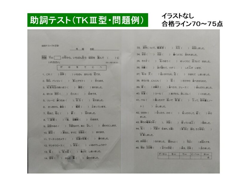 このテストは、問題にイラストが提示されていません。助詞は「が、は、を、で、に、へ」から1つ選択する点ではTKⅡ型と同じです。絵に頼れず自分の力で文を読んでそれに合う助詞を判断しなければいけないので、TKⅡ型より少し難しいです。このテストの到達目標は75点。このレベル以上であれば、苦手な助詞を取り出して指導することも可能ですが、60~70点以下の場合は、TKⅡ型同様、助詞の基礎・基本から一通り指導したほうがよいでしょう。