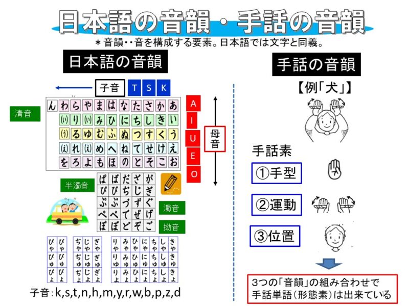 どのような言語も(日本語も日本手話も)、その言語を構成する最小単位である「音韻」(=日本語の場合、「文字・指文字」と同じ)があり、その音韻の組み合わせで「単語」(語)が構成され、さらにそれらの単語を並べて「文」が作られていきます。そして単語を並べて文が作られる時のルールが「文法」(統語規則)です。