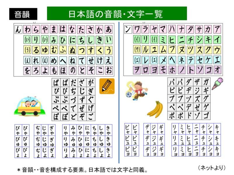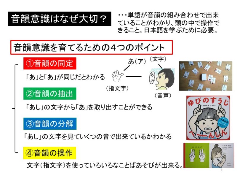 また、日本語で「いぬ」という単語が、「い」「ぬ」という二つの音韻から成り立っていることが認識できる力を「音韻意識」と言いますが、この音韻意識がないと、頭の中で音韻(=文字・指文字)を思い浮かべて単語をつくったり文を作ったりすることが出来ません。その意味で、音韻は読み書きの土台となる力です。