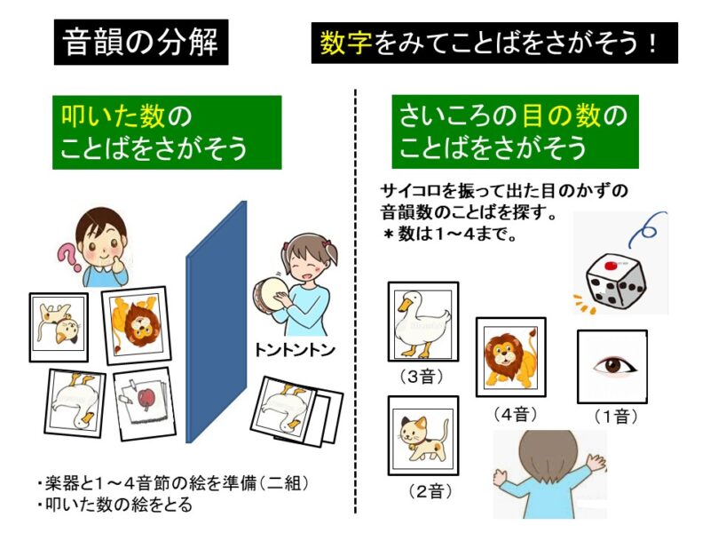 単語を見て(音声をきいて)、いくつの音韻(文字)でできているからかわかることです。音をきいて(音数をきいて)、というのは、聴力的に重度の子には難しい遊びです。ことばの音韻数が増えてくると(4~5音以上)音をいくつ叩いたのか音の分離が困難になるので、3音節くらいの単語でやるとよいでしょう。また、学校の階段などで、じゃんけんをしてパーの時は「パイナップル」(6音)、グーの時は「グリコ」(3音)、チョキの時は「チョコレート」(5音)上がるといった遊びも音韻の分解のあそびです。
