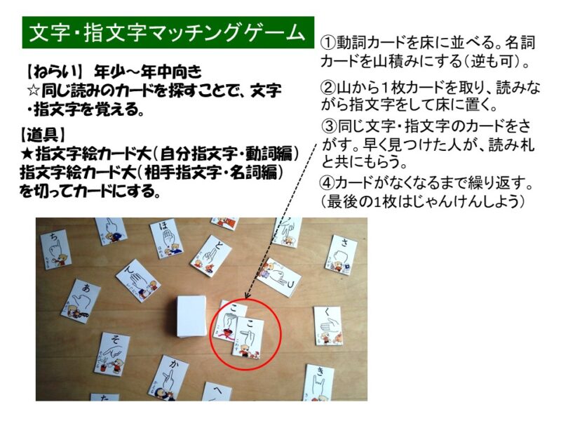 文字の「ア」と指文字の「ア」と音声の「ア」が同じとわかることです。同じものをさがすというマッチングの活動なので、比較的年齢が小さい子にも出来る遊びです。