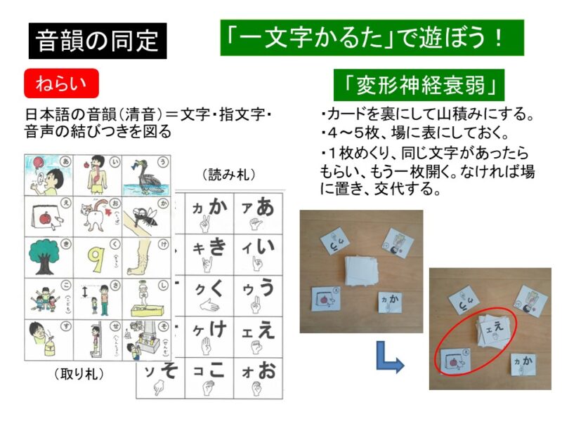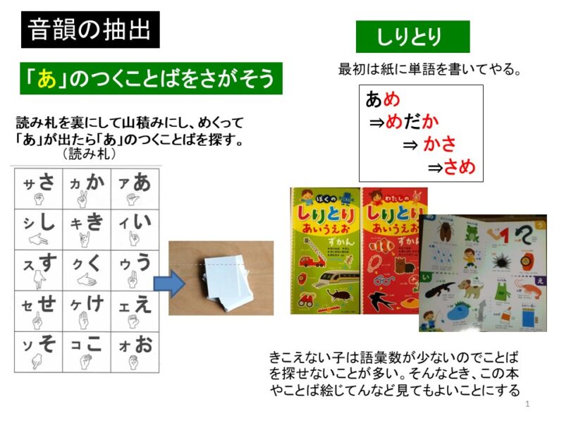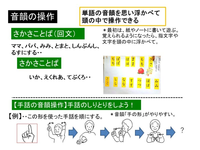 音韻を意識する力は、きこえる子であれば、通常4歳代で、例えば「いぬ」という単語が「い」と「ぬ」という二つの音から成り立っていることが理解できるようになりますが(天野,1970)、この力は、きこえない子も4~5歳頃(幼児期後半)からだんだんとついてきます。つまり、それまではコミュニケーションの手段・方法であったことば(ここでは日本語)が、そのことば(日本語)を意識的に取り出して、頭の中にそのことば(日本語)を思い浮かべて、そのことば(日本語)について、いろんな角度から考えることができるようになってきます。例えば、『イのつくことばさがし』とか『しりとり』などは、語頭や語尾に着目した遊びですが、このような活動ができるようになってきます。こうした活動は、ことば(日本語)を頭の中に対象化(イメージ化)し、そのことば(日本語)について考えたり操作したりする力の向上につながります。