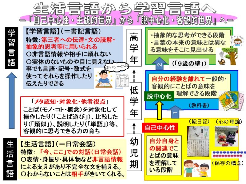 そして、幼児期後半に音韻意識を高め、日本語を対象化・客観化できる力を伸ばすことが、自分自身のことから一歩離れた、客観的・一般的な内容である「教科書」を自分で読んで理解する力の向上や、文法といった単語の並べ方や変化のルールを考える力、さらに自分で文を作る力(構文力)の向上にもつながります。このような、ことばを頭の中で操作する力は、抽象的な記号(言語、数字、記号などの象徴機能=symbol)を動かす練習にもなっていますから、学習言語に不可欠な力を高めることに繋がっていることになります。