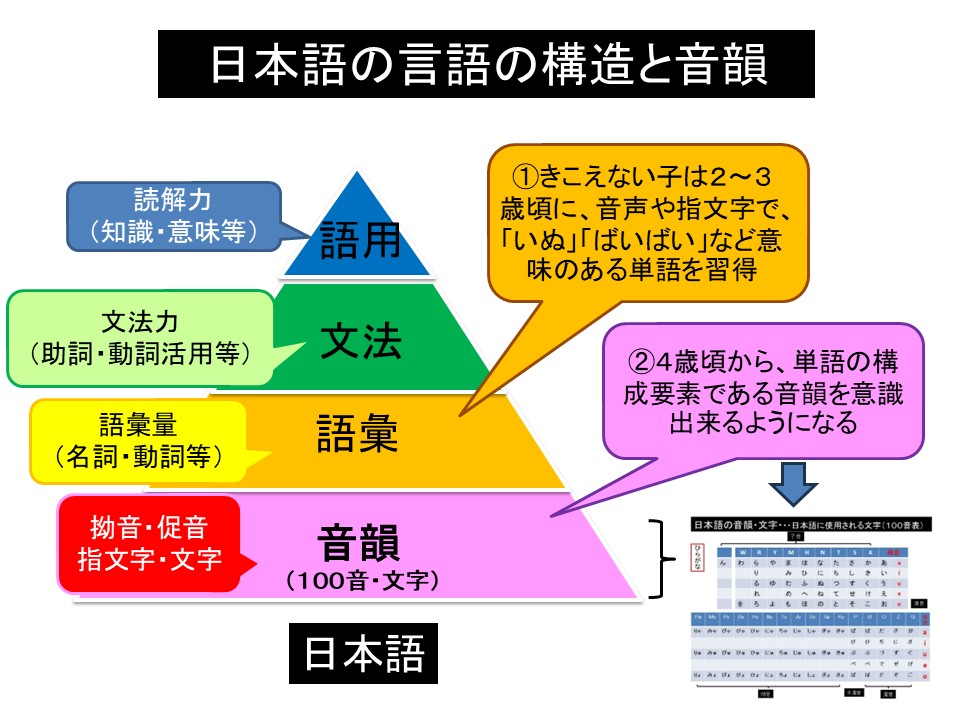 また、日本語で「いぬ」という単語が、「い」「ぬ」という二つの音韻から成り立っていることが認識できる力を「音韻意識」と言いますが、この音韻意識がないと、頭の中で音韻(=文字・指文字)を思い浮かべて単語をつくったり文を作ったりすることが出来ません。その意味で、音韻は読み書きの土台となる力です。