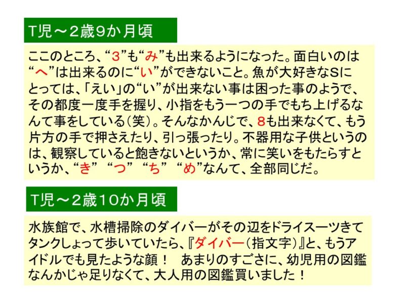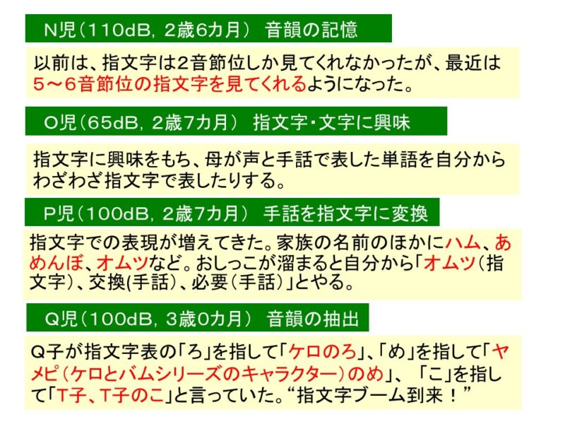 もう一つ、紹介します。2歳半のPちゃん(重度難聴・HA装用)です。Pちゃんは2歳を過ぎてから日本語の文字や指文字(会話の中で出現する単語に指文字を使う等)に興味を持ち始め、いくつかの指文字を並べて日本語の単語が習得されている子です。