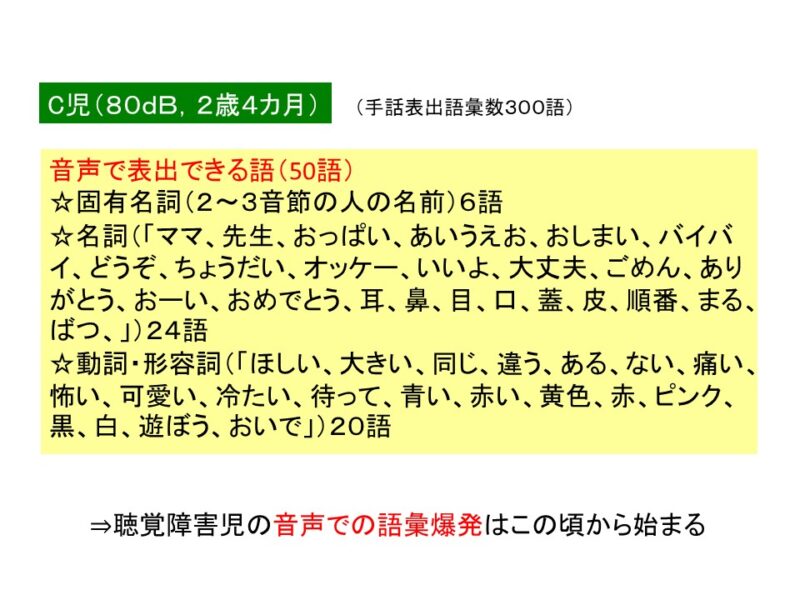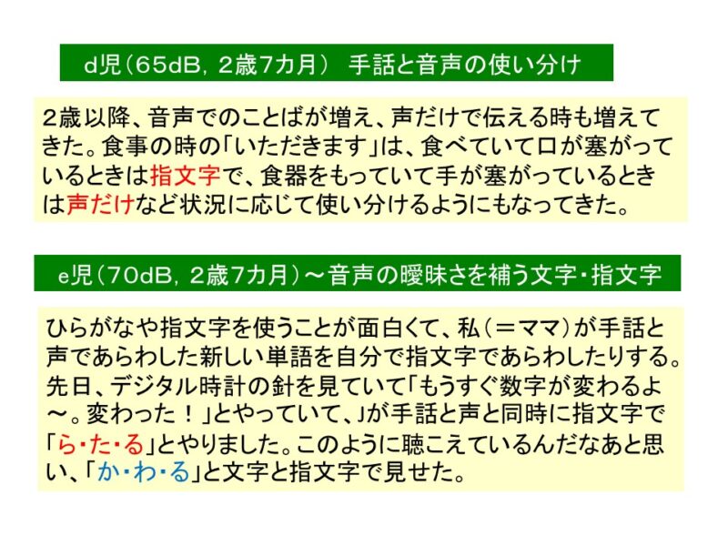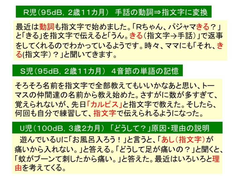 聴力90dBあたりを境にして、それ以下の軽中度難聴児(+人工内耳装用児)は、手話からスタートしつつも、聴覚からの言語入力があるので、1歳後半あたり(個人差あり)から音声日本語が獲得されていき、手話の会話に音声から獲得した日本語の単語が入ってきます。その分、日本語習得も早いです。収集した事例では、1歳後半から2歳前頃から日本語獲得が始まる子が多いです。→事例参照