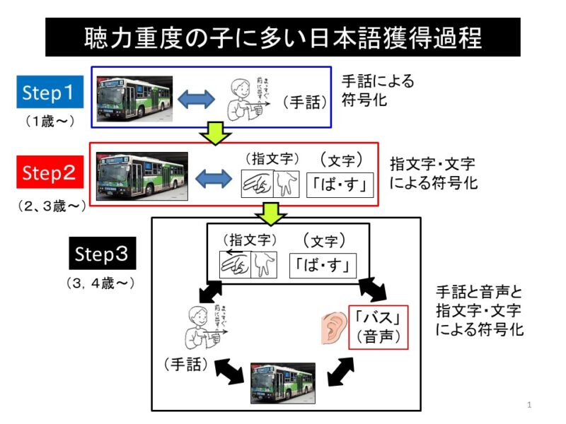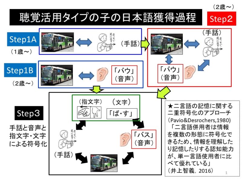 まず、下図のように、①聴覚活用が得意なタイプ(軽中度難聴児等)と、②聴覚活用が得意ではないタイプ(高度・重度難聴児HA装用)では、添付ファイルに示したように、日本語獲得のプロセスが若干異なります(但し0~1歳はいずれも手話からスタート)。人工内耳装用児は施術時期にもよりますが、やや遅めの①タイプの子が多いです。