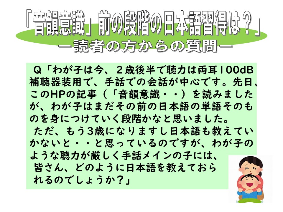 | 「わが子は今、2歳後半で聴力は両耳100dB補聴器装用で、手話での会話が中心です。先日、このHPの記事(注:上記)を読みましたが、わが子はまだその前の、日本語の単語そのものを身につけていく段階かなと思いました。 ただ、そろそろ3歳になりますし日本語も教えていかないと・・と思っているのですが、わが子のような聴力が厳しく手話メインの子には、皆さん、どのように日本語を教えておられるのでしょうか?ご存知でしたら教えて下さい」 |