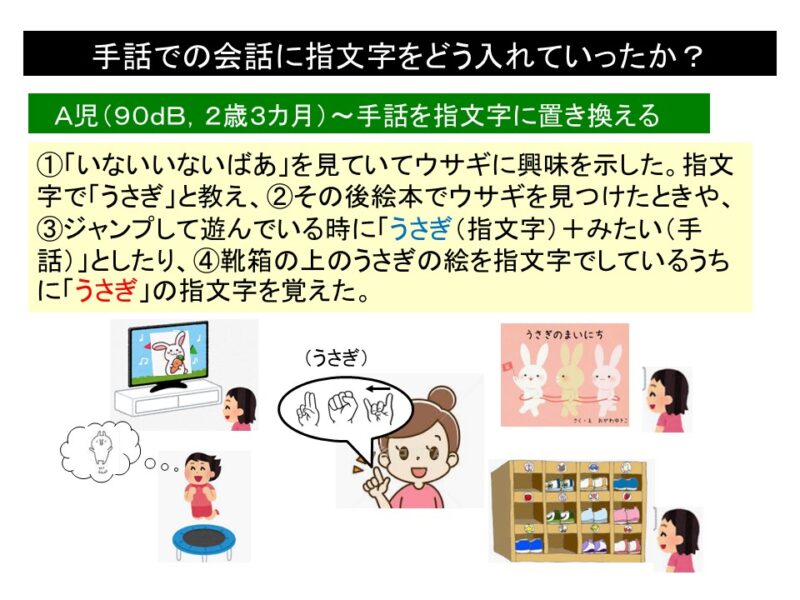 まずは、いくつか事例を紹介します。一つ目の事例(A児)は、私が知る限りでは最も早く日本語の習得が始まった子どもの例で、2歳3か月のデフファミリーのお子さんです。「/うさぎ/」の手話に指文字でマッチングしていく過程で自然に「うさぎ」と指文字で表出できるようなった子です。残りの事例はいずれも2歳半以降での手話会話の中に指文字による単語が部分的に導入され、それを子どもが見て自分でも使えるようになったという事例です。