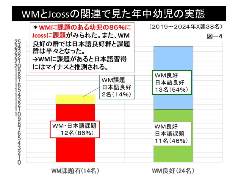 また、このWMの結果と年中時のJcossの通過項目数(=日本語語彙力)との関連から以下のことがわかりました(図ー4)。
