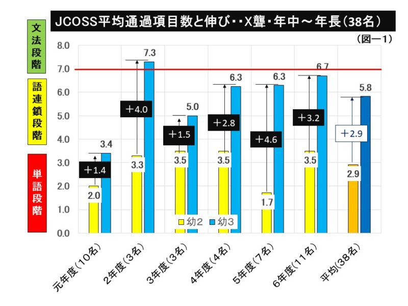 上の図(図1,2)はX聾学校幼稚部で、この数年の間にやったJ.coss(日本語理解テスト)の結果です。一つ目の棒グラフ(図ー1)は、6年間に実施した幼児(全38名)の年度別の平均通過項目数です。年中の時に実施したJcossの平均通過項目数(黄色棒線)とその1年後に実施した年長の時のJcossの平均通過項目数(水色棒線)です。