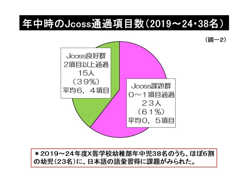 二つ目の円グラフ(図ー2)は、年中時実施のJcossの到達レベルから、比較的日本語の単語習得レベルがよいグループ(Jcoss通過2項目以上)とやや習得度が少ないグループ(Jcoss通過0~1項目)の二つの群に分けたものです。年中段階でJcoss通過2項目以上の子どもたちが全体の約4割(Jcoss・日本語良好群)、それ以下の子どもたちが6割(Jcoss・日本語課題群)です。 やや厳しめの子の方が多いのがわかります。具体的に言えば、これら6割のJcoss課題群の子どもたちは、例えばJcossの名詞問題「くつ、とり、いぬ、りんご」の4つが日本語で理解できたかできなかった子たちということです。聴児であれば年中さんで知らないことばはないでしょう。Jcoss課題群の子たちはこれらの単語も曖昧な子たちです。WM(ワーキングメモリー)に問題があって身についていないのか、それ以外の問題なのか、それを考えてみたいと思います。