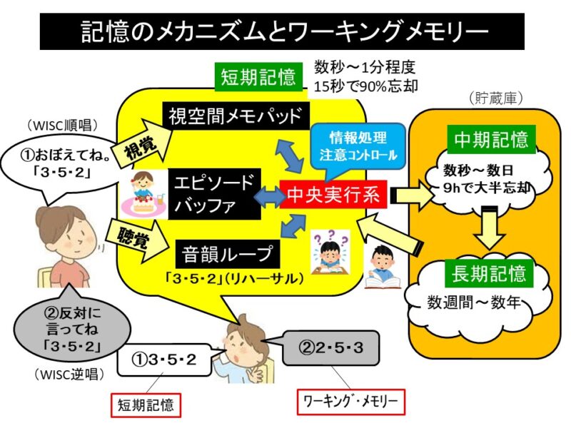 もう一つは、逆順(2・3・1)で再生を求める「逆唱」問題です(この記事冒頭の図にある、①と②の問いです)。「順唱」問題は単純に「短期記憶」をみる問題、「逆唱」問題は数字の変換操作が加わるので「ワーキングメモリー(WM)」をみる問題と考えられています。