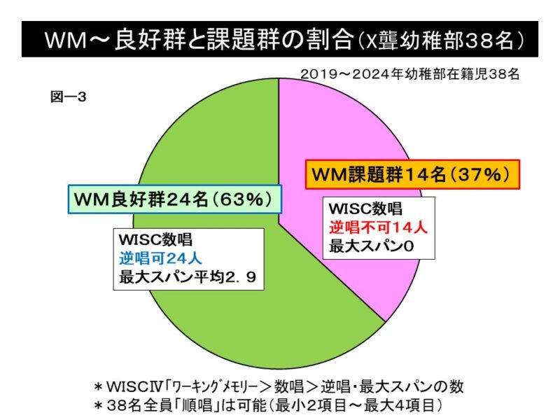 本記事では、「逆唱」が2数字以上可能(例「1,5」→「5,1」)であった幼児をWM良好群に分類し、2数字の逆唱が全く出来なかった子をWM課題群として分類しました。その結果、WM良好群が24名(63%)、WM課題群が14名(37%)で、4割近い幼児にWMの課題があることがわかりました(図ー3)。